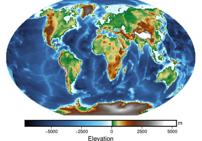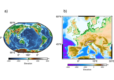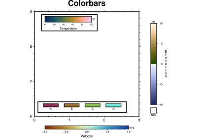 Both horizontal and vertical colorbars are supported. For CPTs with gradational colors (i.e., the lower and upper boundary of an interval have different colors) we will interpolate to give a continuous scale. Variations in intensity due to shading/illumination may be displayed by setting the
